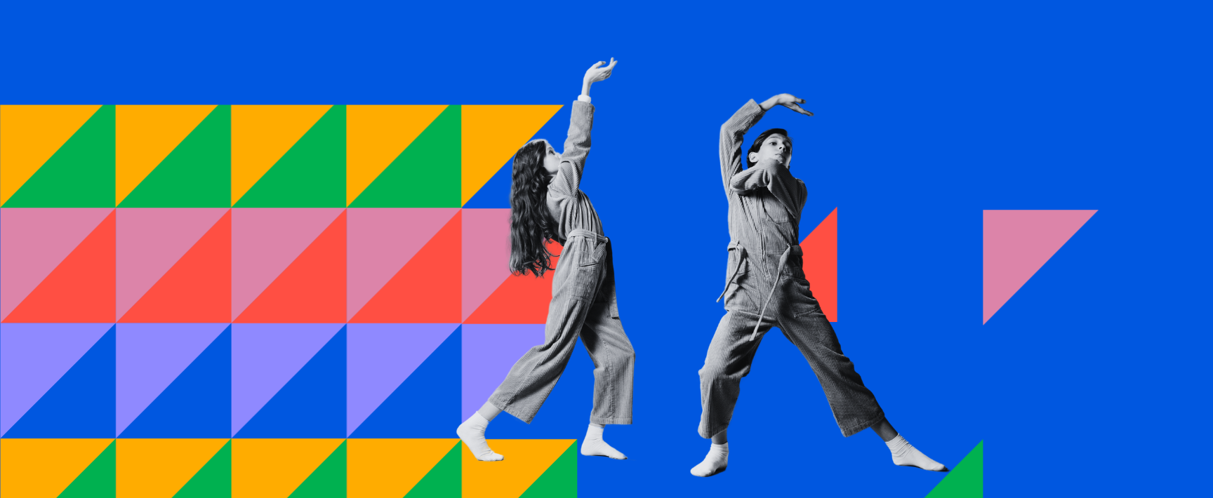 Two people dance in the middle. Blue background and floating triangles are decorative.
